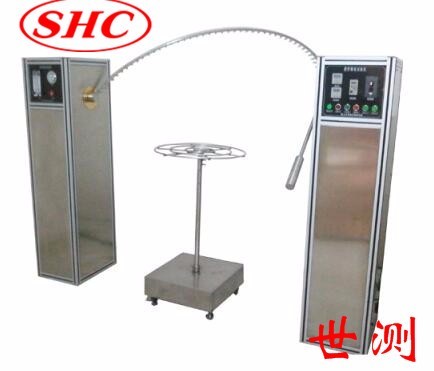 IPX4 擺管式濺水試驗是選擇適當(dāng)半徑的擺管,使樣品臺面高度處于擺管直徑位置上,將試樣放在樣臺上,使其頂部到樣品噴水口的距離不大于200mm; 試驗條件:水流量按擺管的噴水孔數(shù)計算,每孔為 0.07 L/min。噴水面積為擺管中點(diǎn)兩邊各90°弧段內(nèi)噴水孔的噴水噴向樣品。被試樣品放在擺管半圓中心。擺管沿垂兩邊各擺動180°,共約360°,試驗時間:連續(xù)淋水10 min。